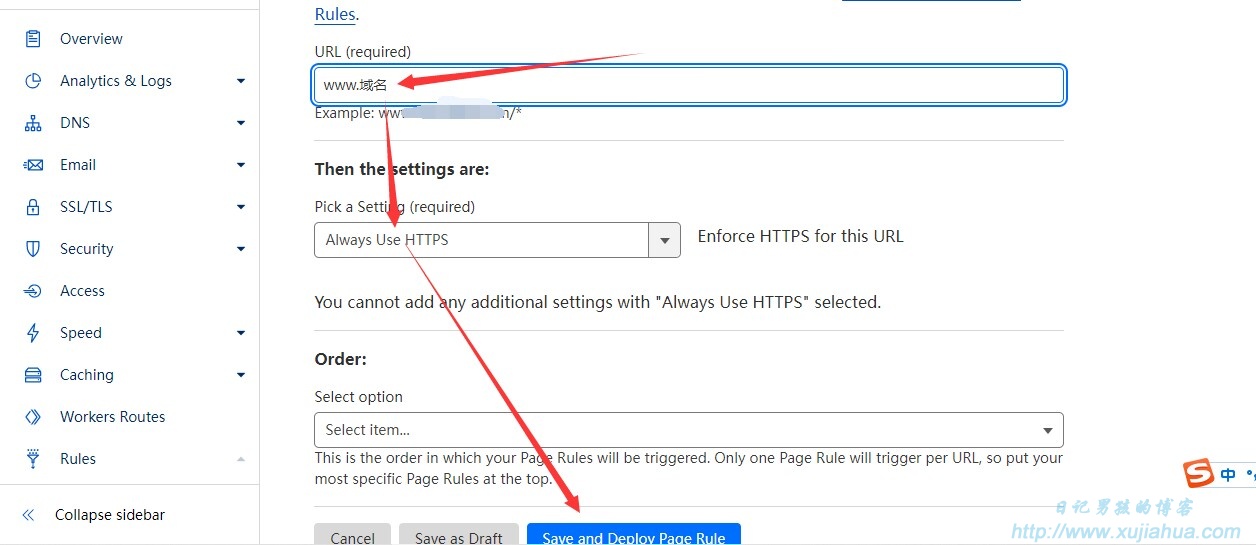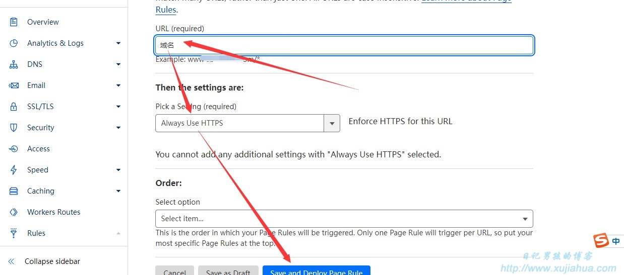在这里填入你的一级域名:xxx.com, 设置为强制 https 跳转 (Always Use Https),保存即可。