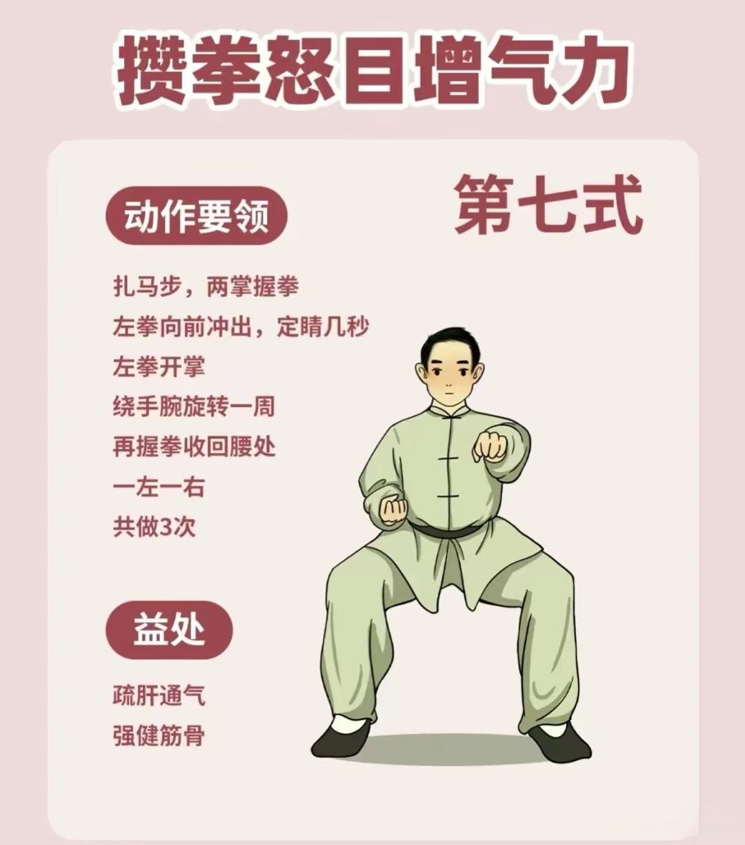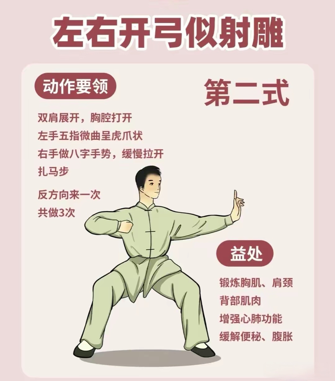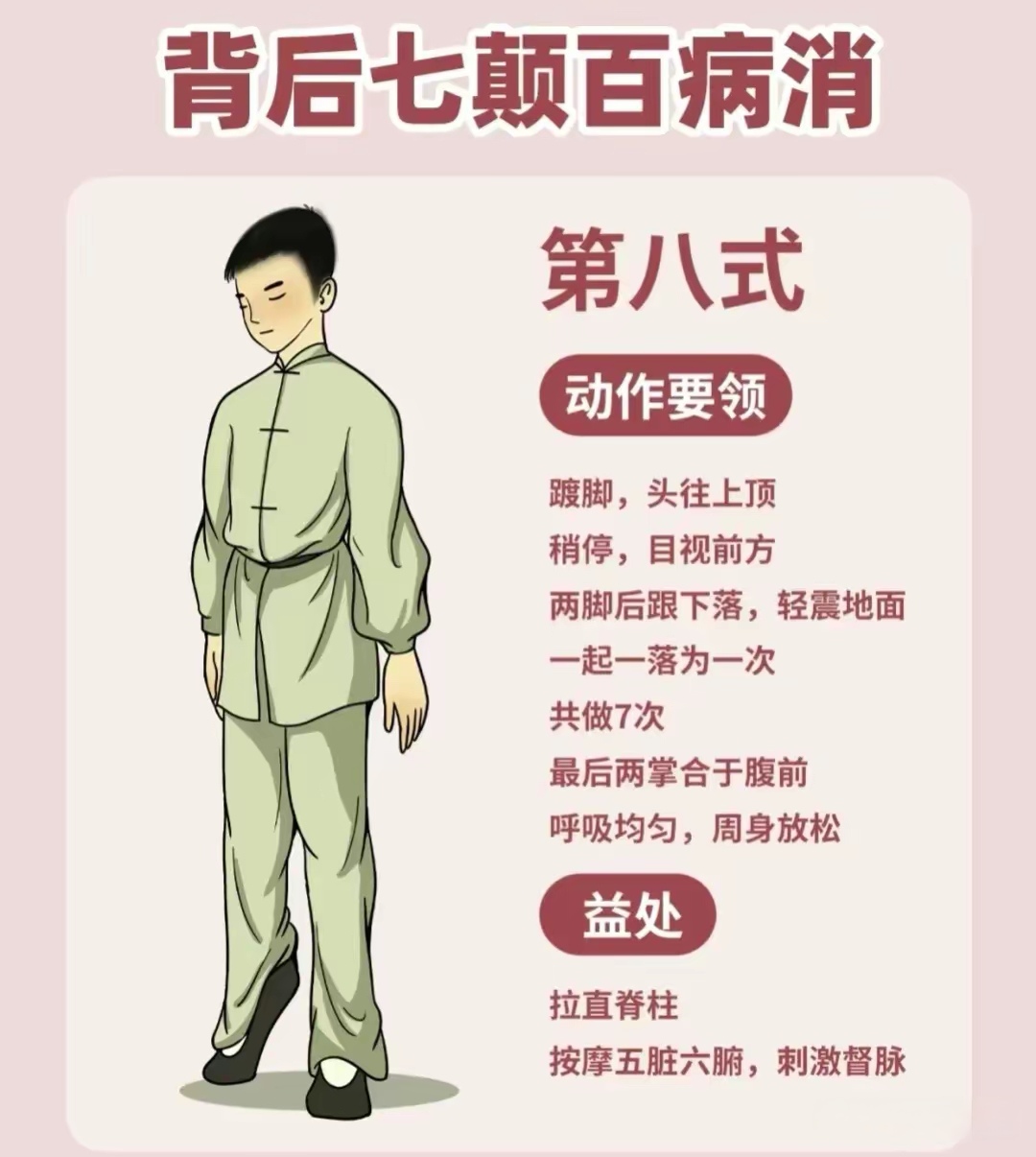 包括:一、叩齿集神,二、摇天柱,三、舌搅漱咽,四、摩肾堂,五、单开辘轳,六、左右辘轳,七、左右按顶,八、钩攀。此法与十二段锦同源异流。武八段:一、两手擎天理三焦,二、左右开弓似射雕;三、调理脾胃须单举,四、五劳七伤望后瞧,五、摇头摆尾除心火,六、背后七颠百病消,七、攒拳努目增气力,八、两手攀足固肾腰