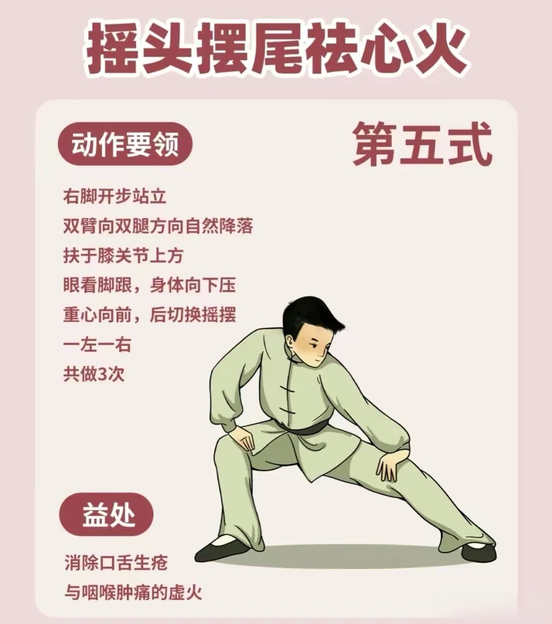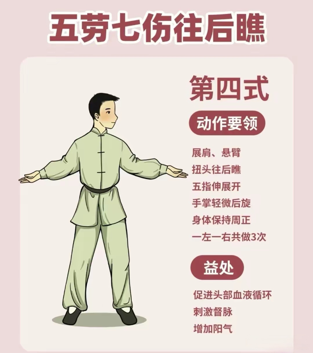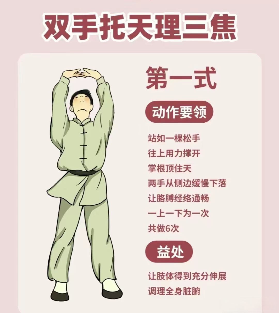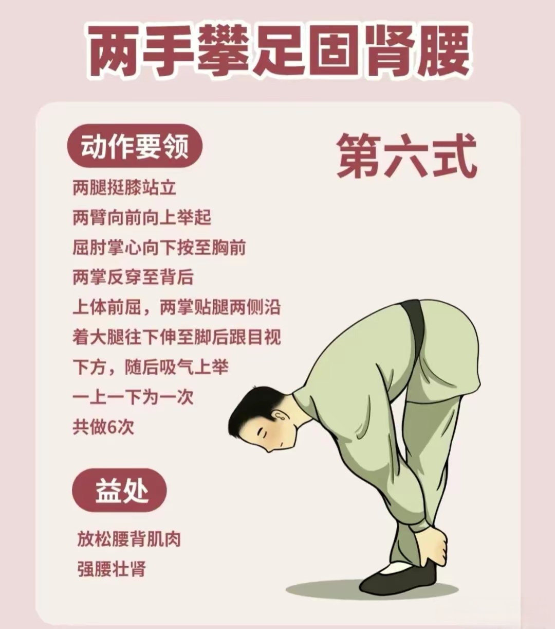包括:一、叩齿集神,二、摇天柱,三、舌搅漱咽,四、摩肾堂,五、单开辘轳,六、左右辘轳,七、左右按顶,八、钩攀。此法与十二段锦同源异流。武八段:一、两手擎天理三焦,二、左右开弓似射雕;三、调理脾胃须单举,四、五劳七伤望后瞧,五、摇头摆尾除心火,六、背后七颠百病消,七、攒拳努目增气力,八、两手攀足固肾腰